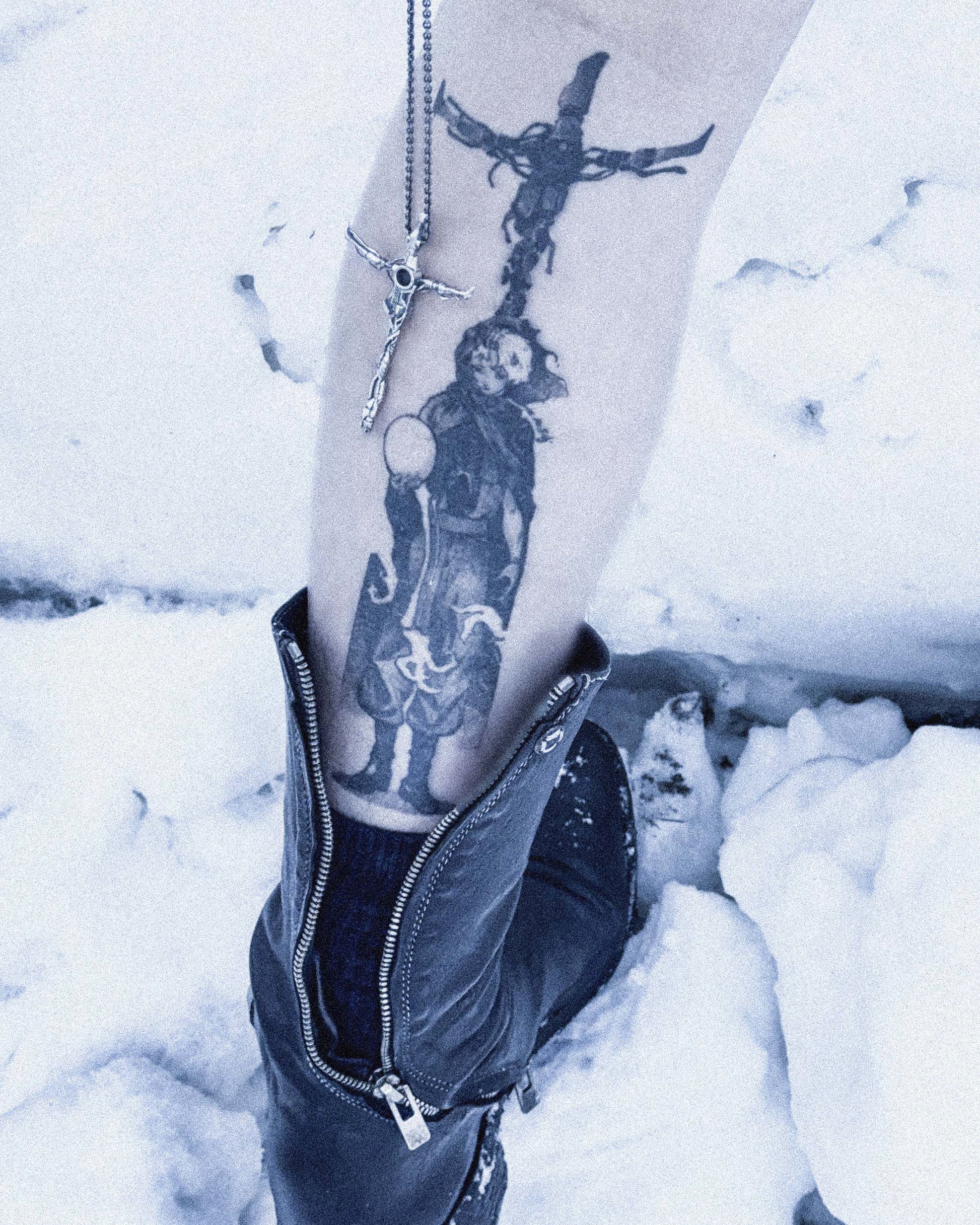 In the movie, the cross the boy carries seems like it is made out of junk; miscellaneous biomechanical parts. He wields it as if it were a weapon, further emphasized by his arrival on a tank and his military overalls.