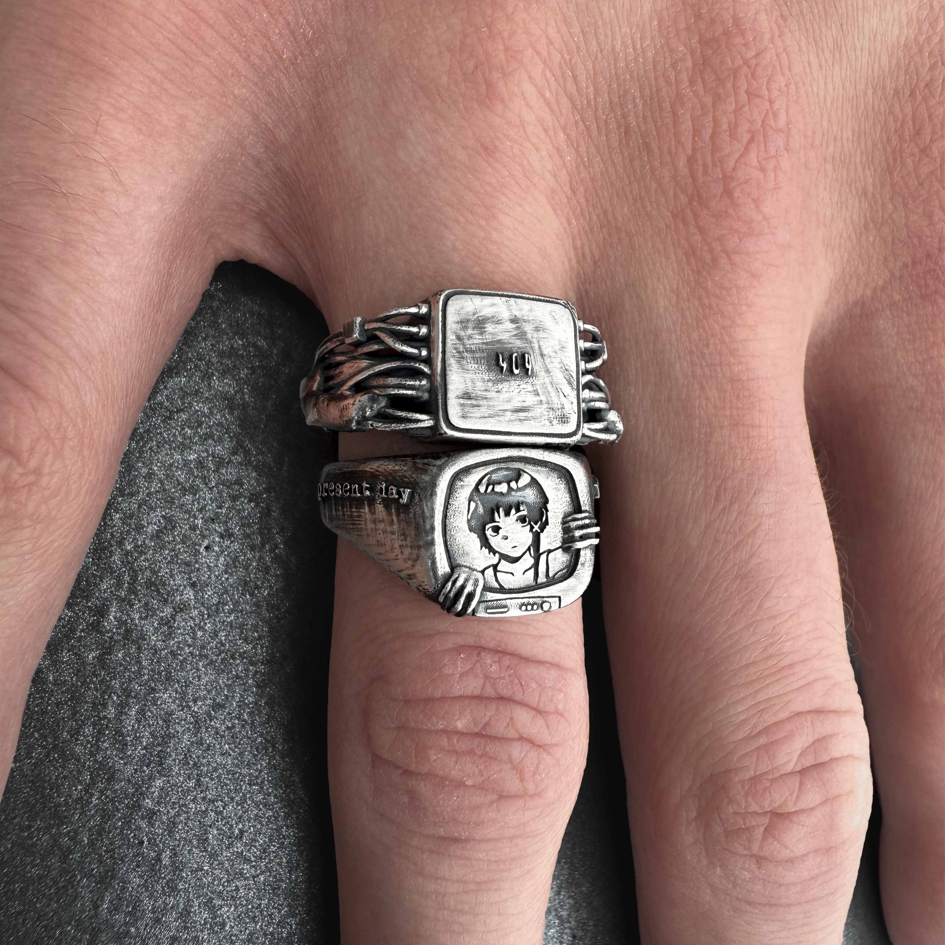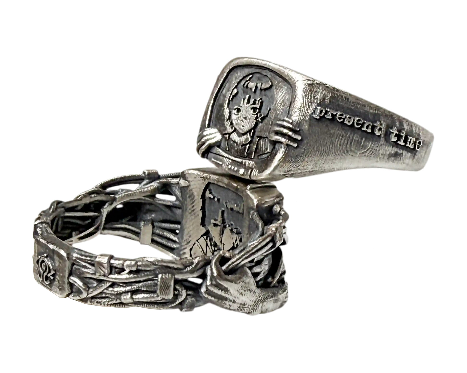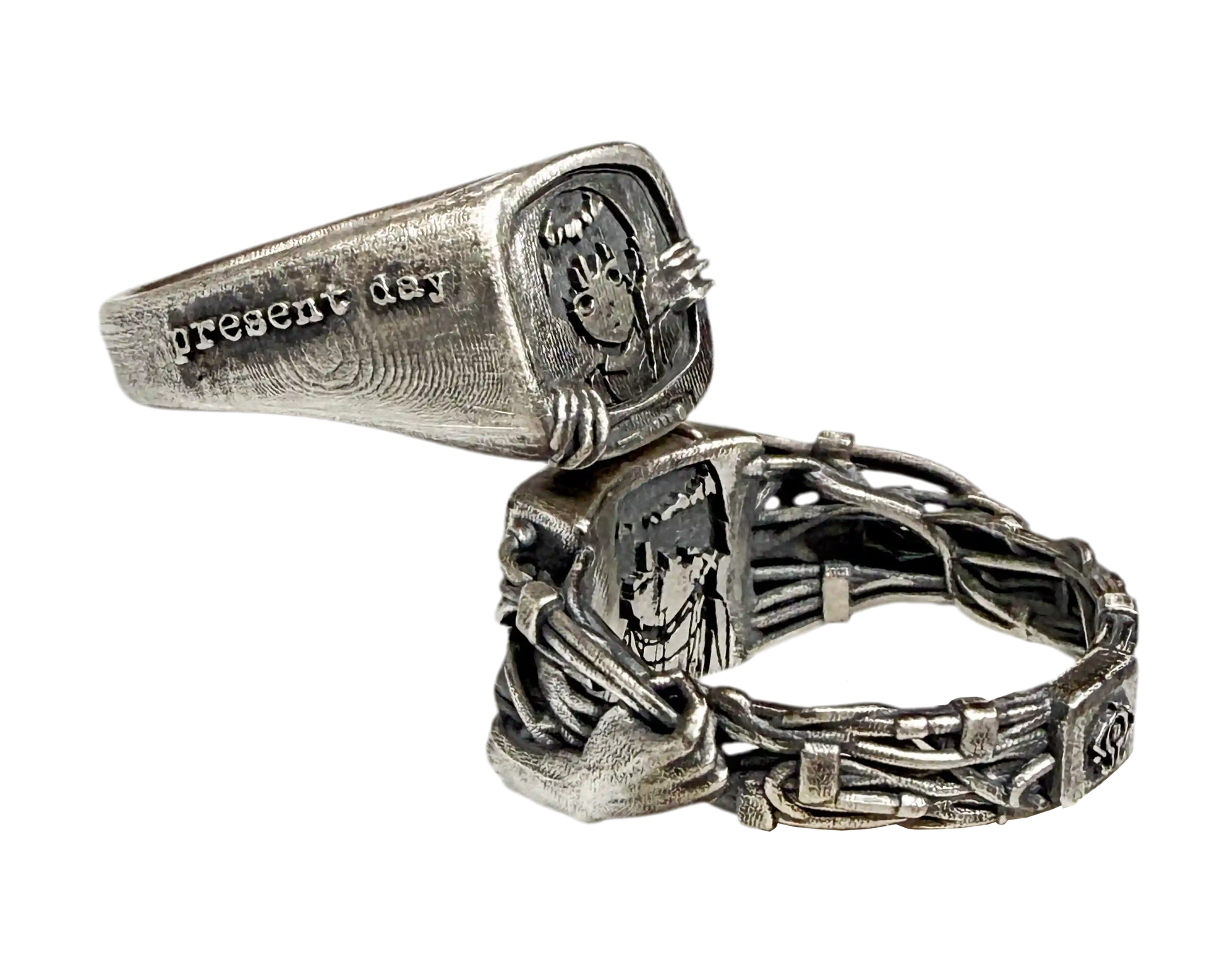 A paired set exploring identity in the digital age. The Virtual embodies the unseen self and its wired tethers, while The Real depicts emergence and presence. One ring hums beneath the surface; the other breaks through. Together, they reflect the tension between being perceived and being real.