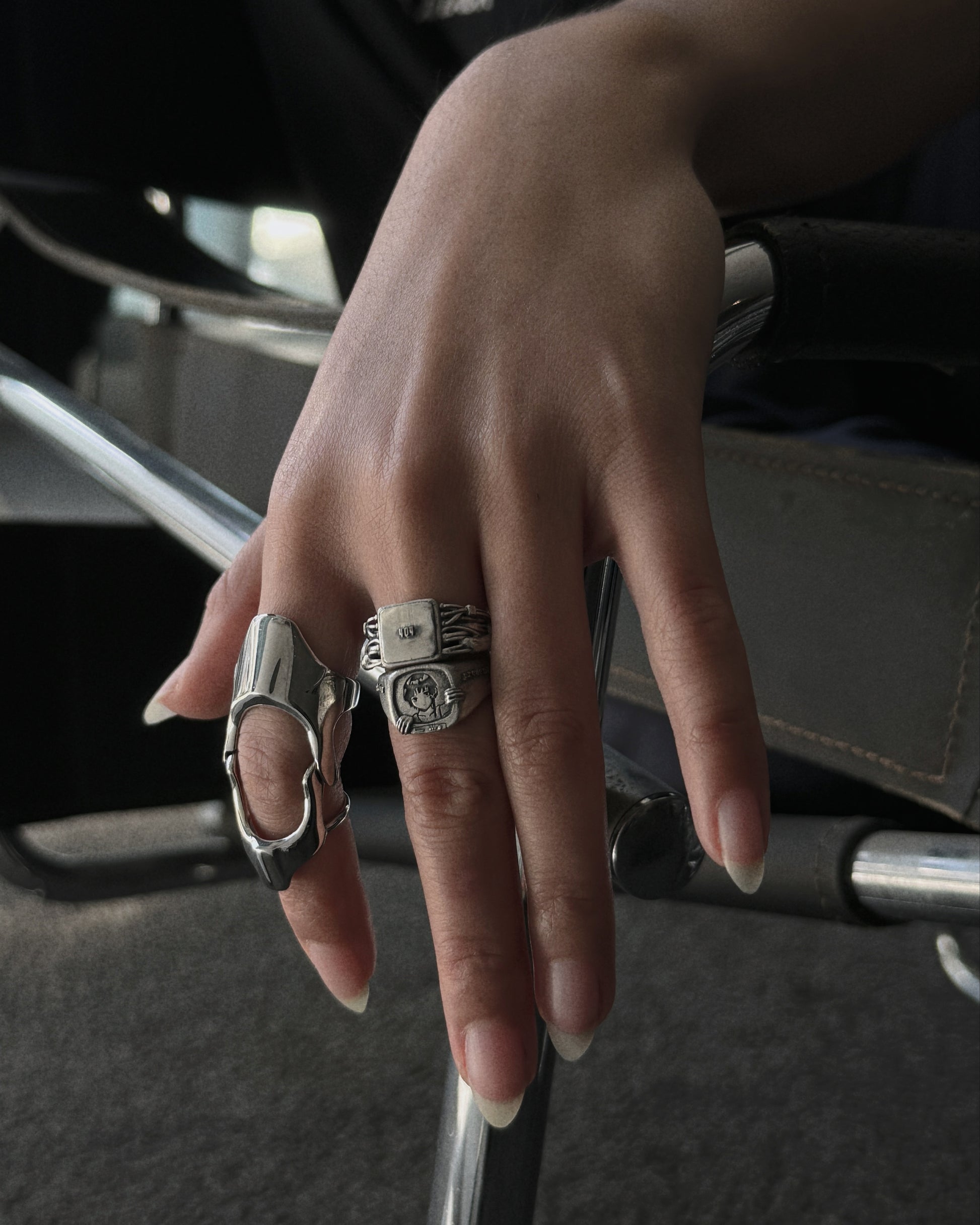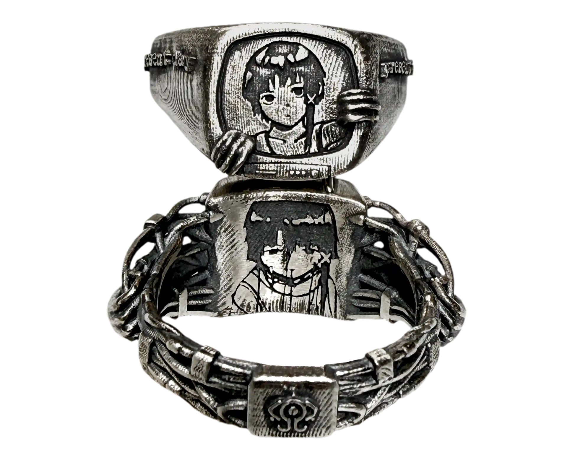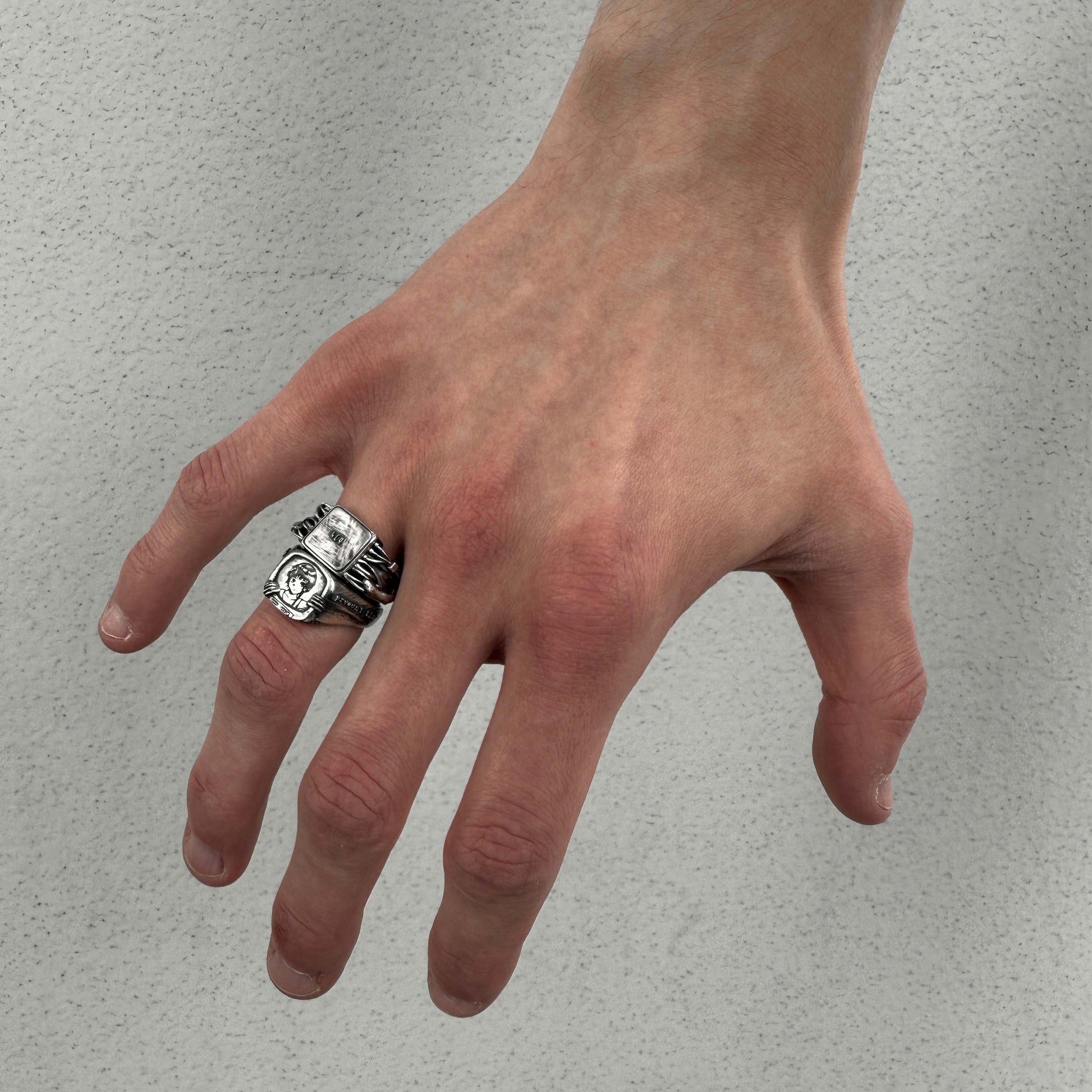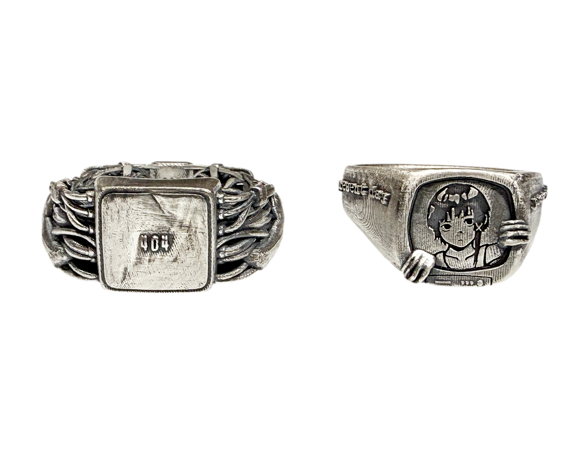 A paired set exploring identity in the digital age. The Virtual embodies the unseen self and its wired tethers, while The Real depicts emergence and presence. One ring hums beneath the surface; the other breaks through. Together, they reflect the tension between being perceived and being real.